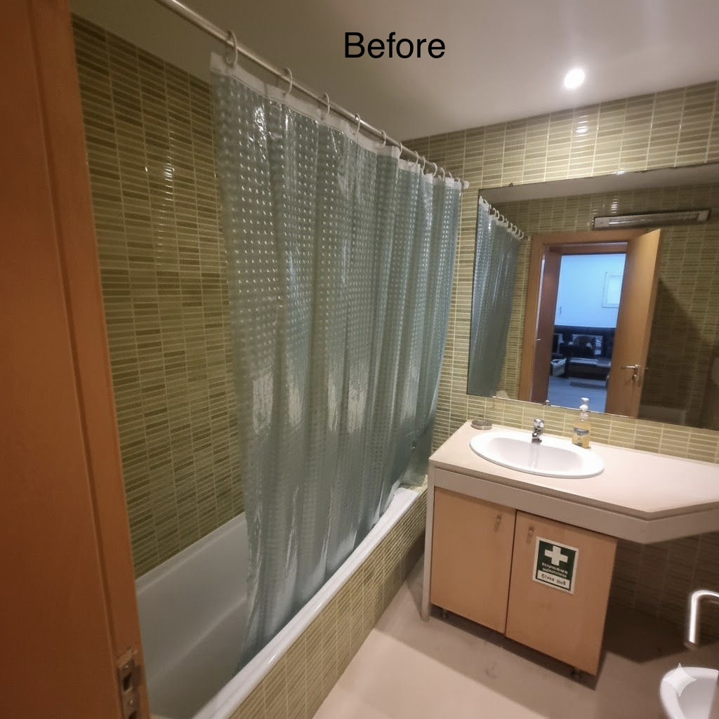 Fully renovated bathroom: removal of old finishes, new layout, updated engineering systems, modern plumbing and finishing materials.